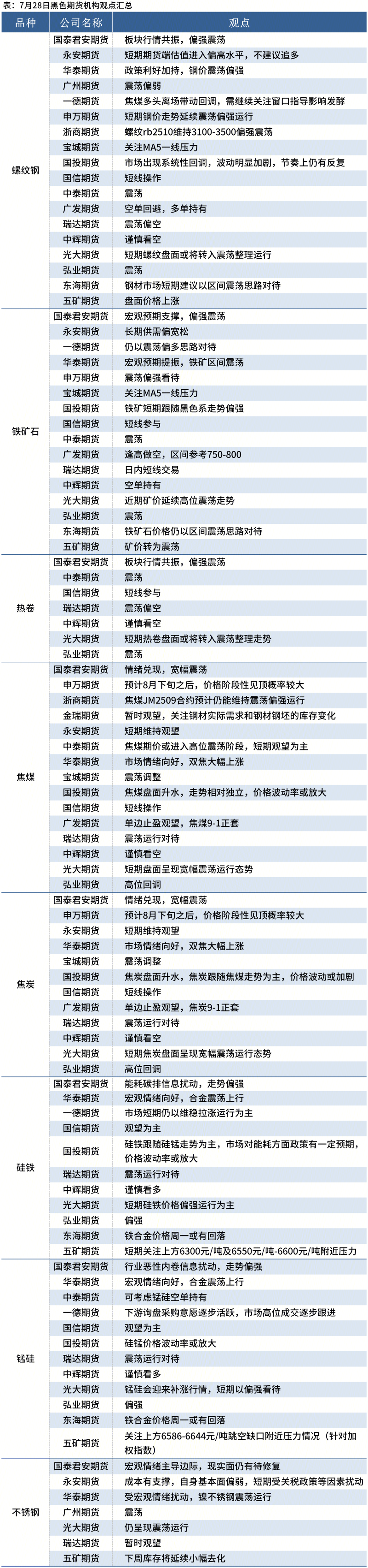 据Mysteel统计7月28日18家期货机构操作策略,其中多数机构料螺纹钢震荡运行,铁矿石震荡运行。具体汇总内容如下: