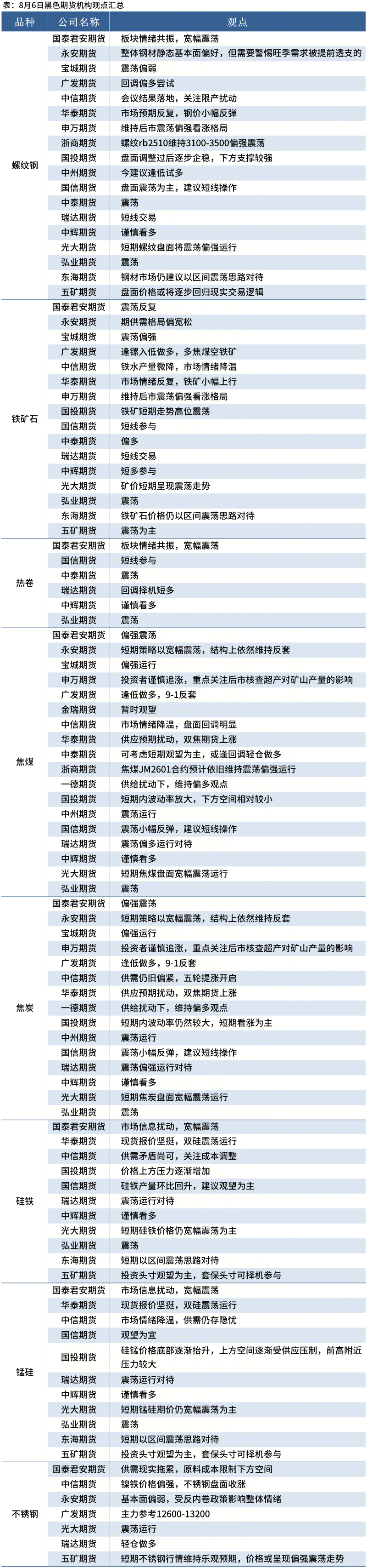 据Mysteel统计8月6日20家期货机构操作策略,其中多数机构料螺纹钢震荡运行,铁矿石震荡运行。具体汇总内容如下: