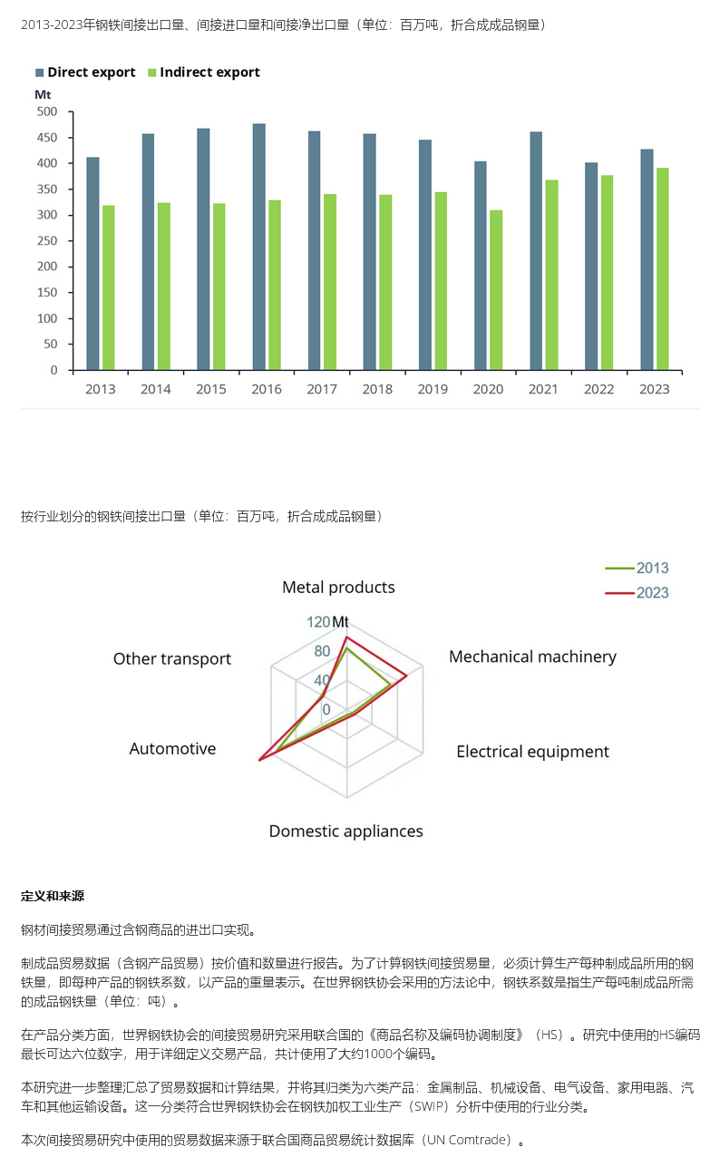 2013年至2023年期间,纳入分析的74个国家/地区的钢铁间接出口量从3.19亿吨增长至3.92亿吨,增幅为23%。2023年,钢铁间接贸易量相当于直接出口量的95%。