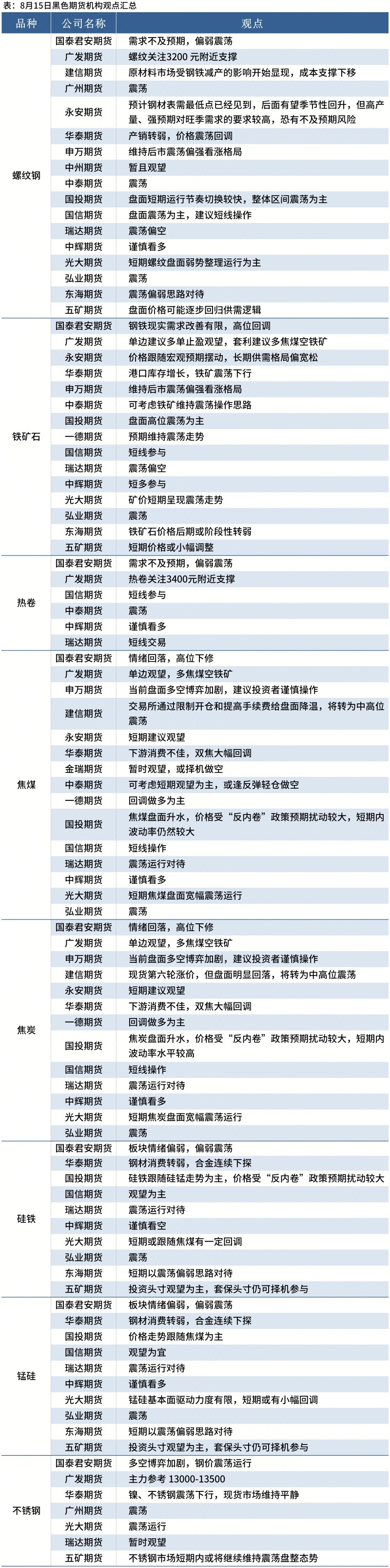据Mysteel统计8月15日19家期货机构操作策略,其中多数机构料螺纹钢震荡运行,铁矿石震荡运行。具体汇总内容如下: