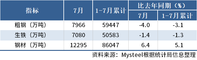 1-7月,中国粗钢产量59447万吨,同比下降3.1%;生铁产量50583万吨,同比下降1.3%;钢材产量86047万吨,同比增长5.1%。