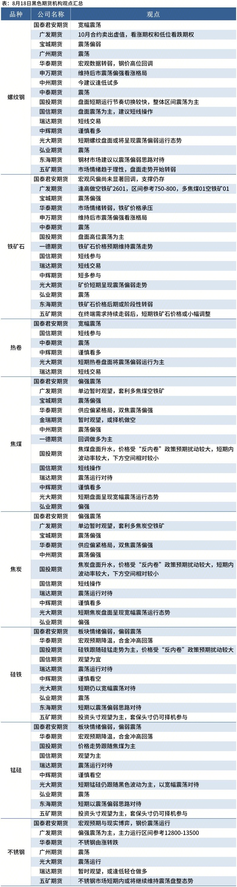 据Mysteel统计8月18日19家期货机构操作策略,其中多数机构料螺纹钢震荡运行,铁矿石震荡运行,焦煤、焦炭震荡偏强。具体汇总内容如下: