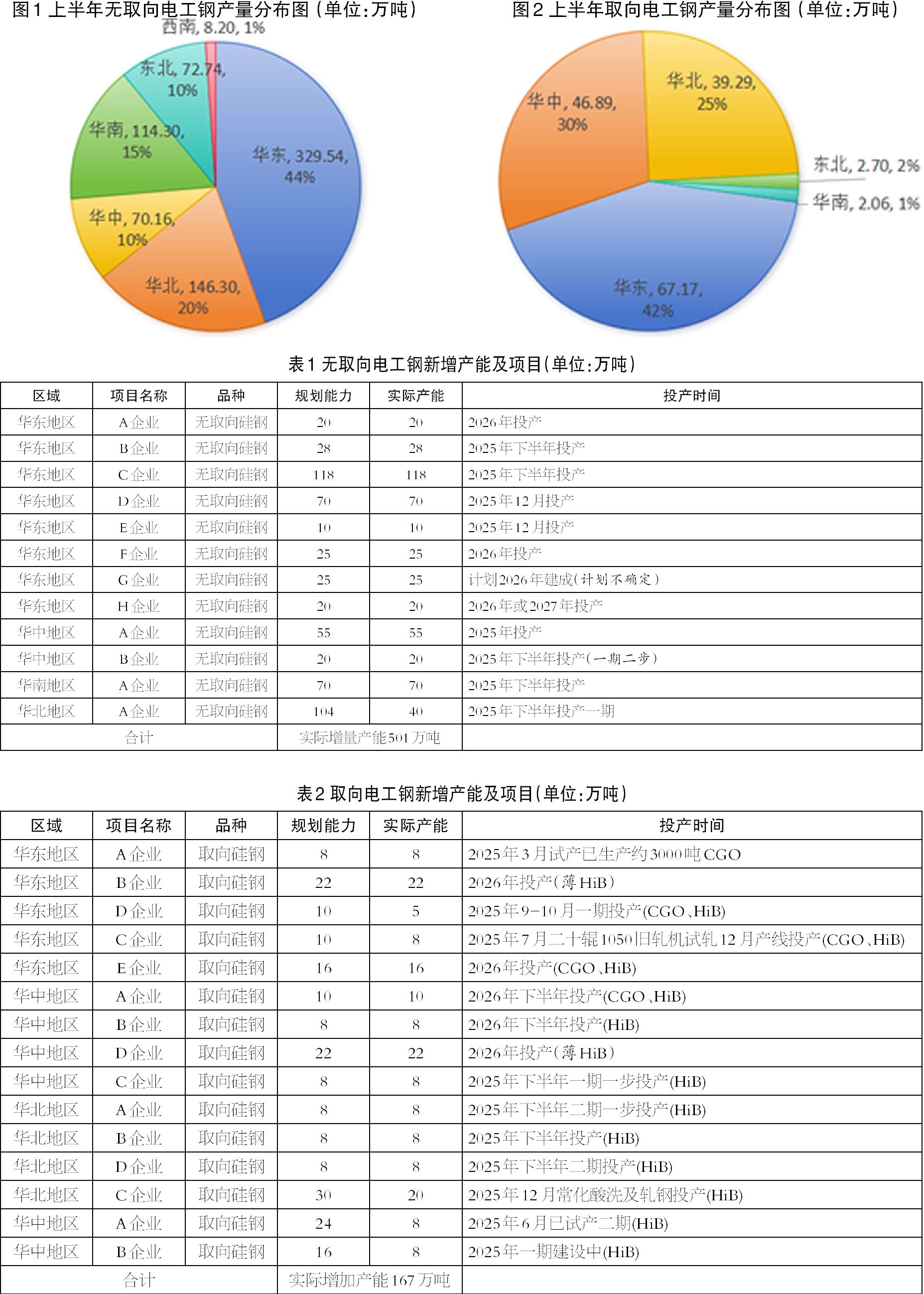 据不完全统计,2025年上半年,我国电工钢在建及计划投产项目为27项;其中,取向电工钢15项,年产能共计167万吨;无取向电工钢12项,年产能共计501万吨。