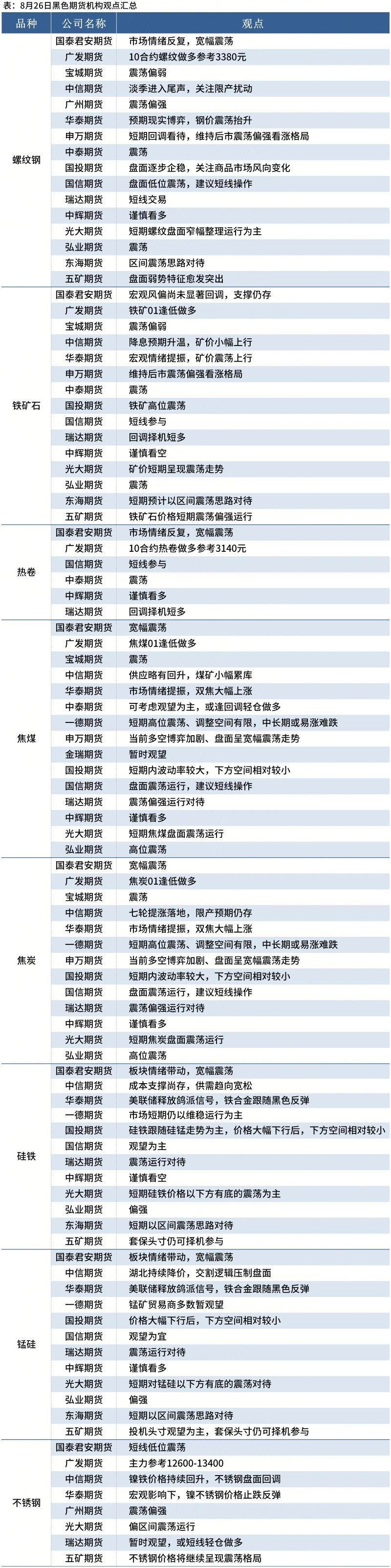 据Mysteel统计8月26日18家期货机构操作策略,其中多数机构料螺纹钢震荡运行,铁矿石震荡运行。具体汇总内容如下: