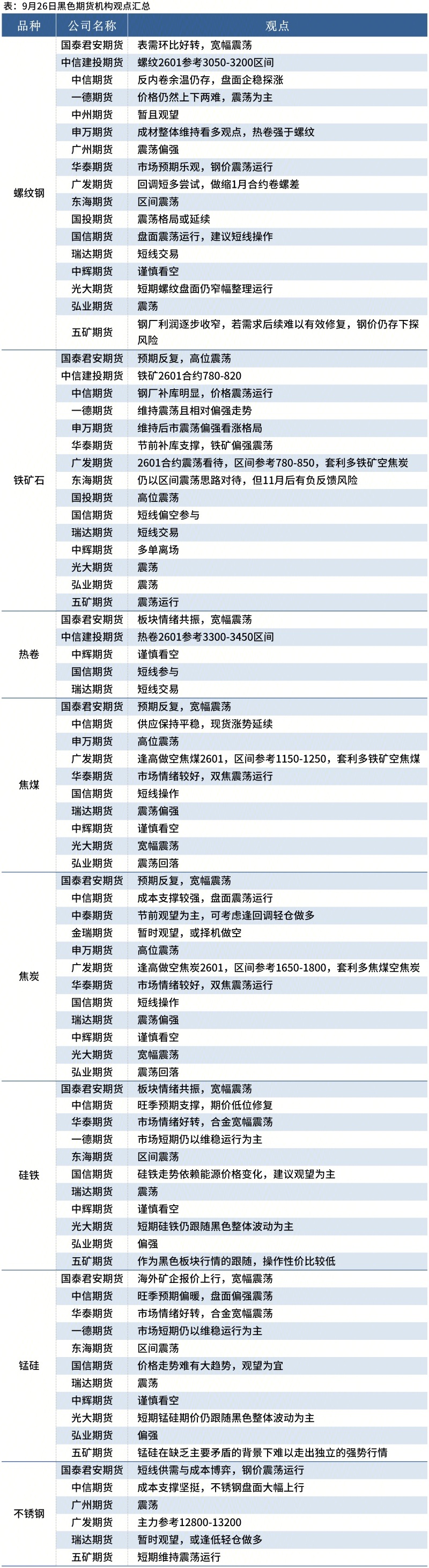 据Mysteel统计9月26日19家期货机构操作策略,其中多数机构料螺纹钢震荡运行,铁矿石震荡运行。具体汇总内容如下:
