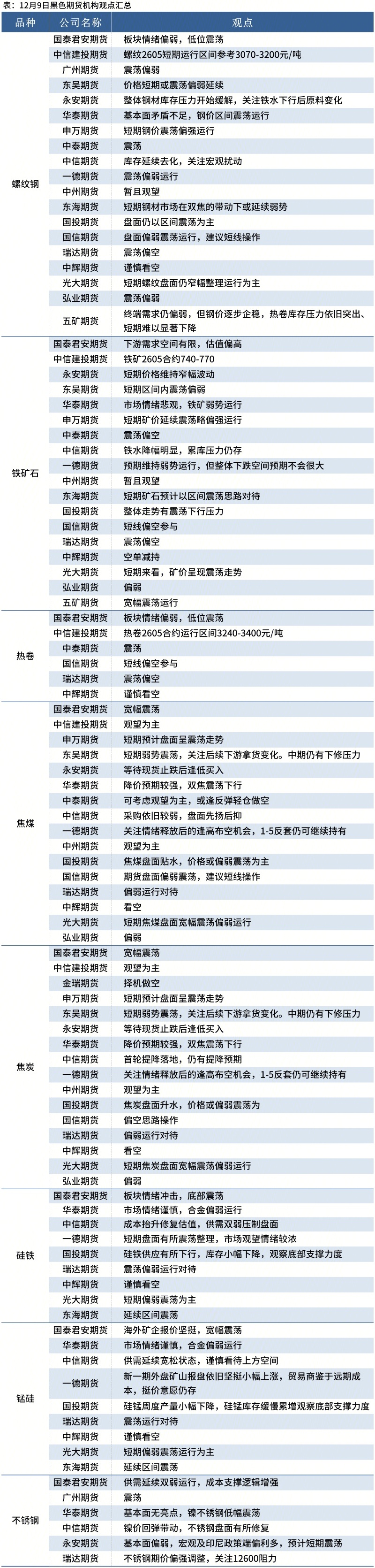 据Mysteel统计12月9日20家期货机构操作策略,其中多数机构料螺纹钢震荡偏弱,铁矿石震荡偏弱。具体汇总内容如下: