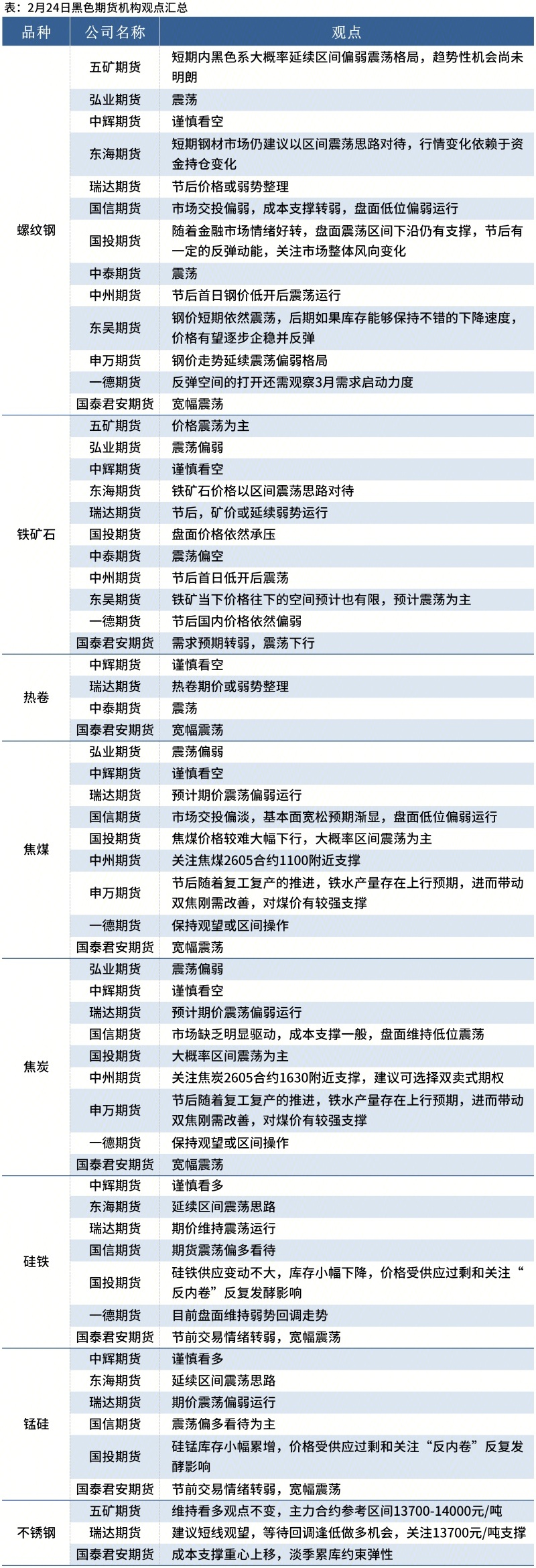 据Mysteel统计2月24日13家期货机构操作策略,其中多数机构料螺纹钢震荡运行,铁矿石震荡运行。具体汇总内容如下: