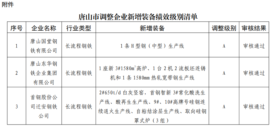 根据《河北省钢铁等7个重点行业环保绩效创A审核评定管理办法(试行)》,经企业申请、市级初审、省级审核等程序,你市唐山国堂钢铁有限公司、唐山东华钢铁企业集团有限公司、首钢股份公司迁安钢铁公司等3家企业新增装备评定为重点行业环保绩效A级。