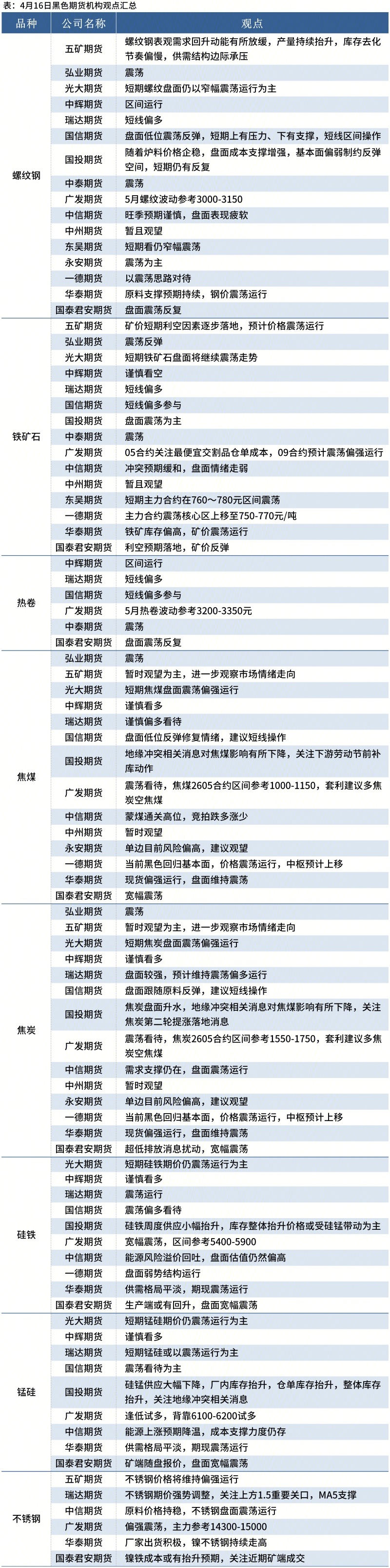 Mysteel统计4月16日16家期货机构操作策略,其中多数机构料螺纹钢震荡运行,铁矿石震荡运行。具体汇总内容如下: