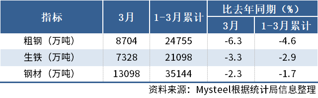 1-3月,中国粗钢产量24755万吨,同比下降4.6%;生铁产量21098万吨,同比下降2.9%;钢材产量35144万吨,同比下降1.7%。
