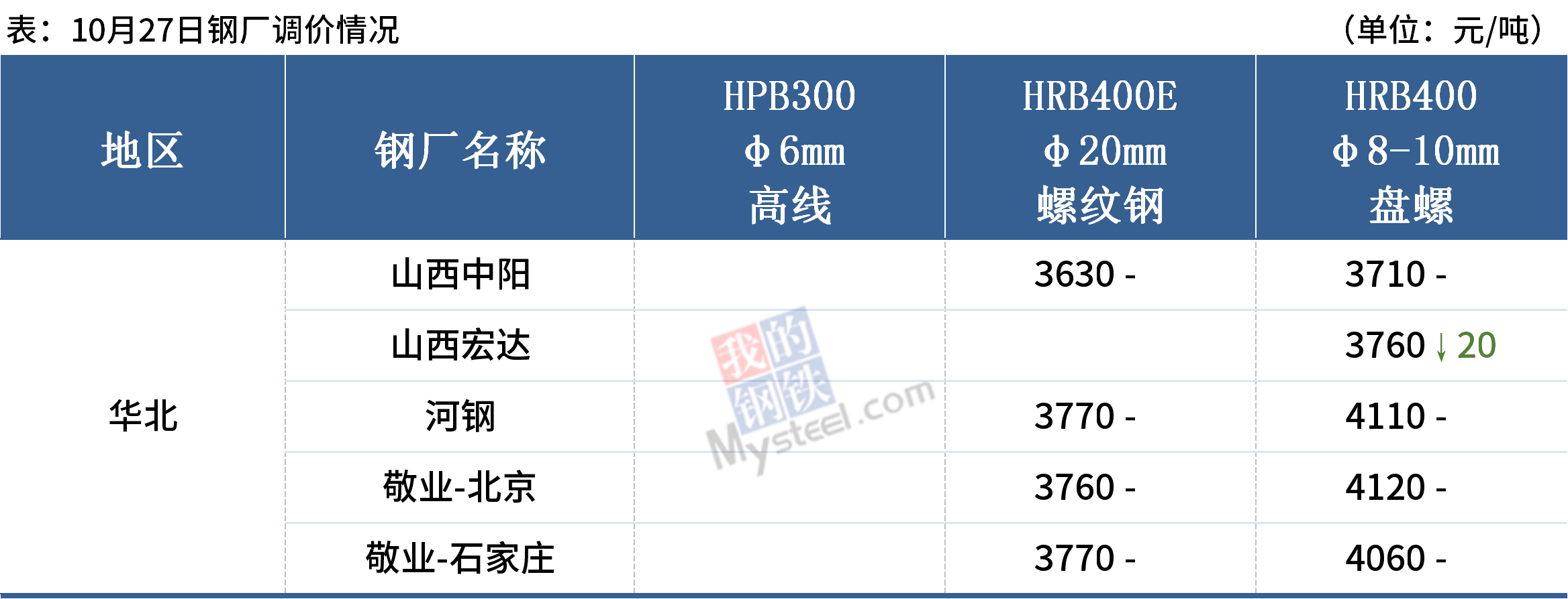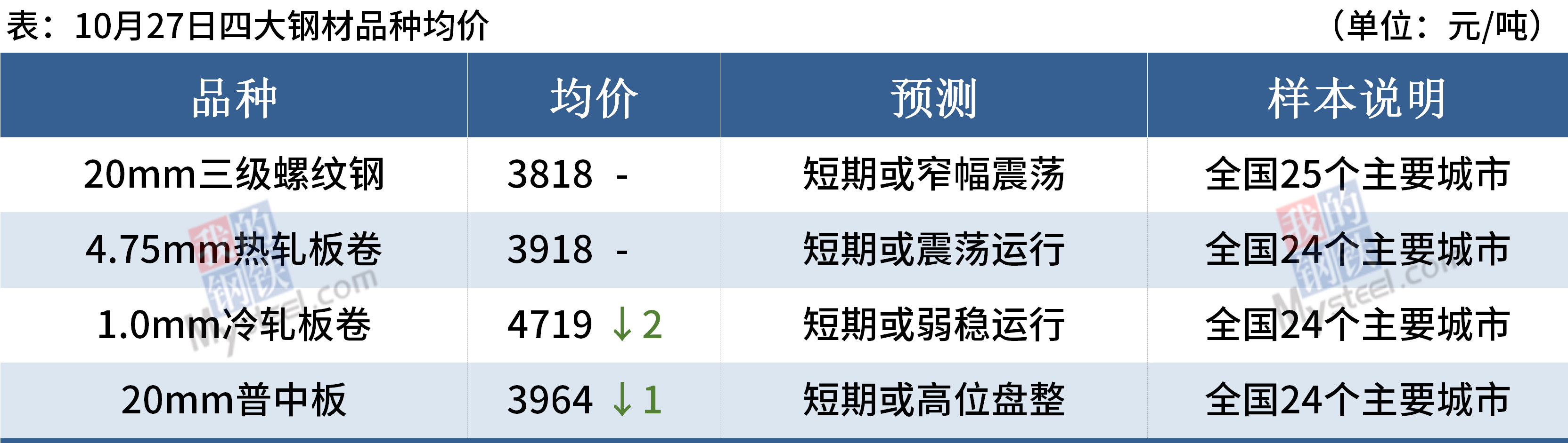 ◎ 10月下旬开始,华北地区带钢生产企业集中出台检修计划,截止10月27日统计结果,预计11月份涉及9家长流程带钢生产企业,9条轧线检修,影响带钢日产量3.9万吨左右。