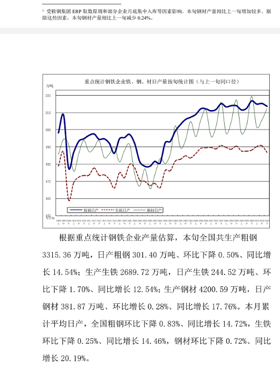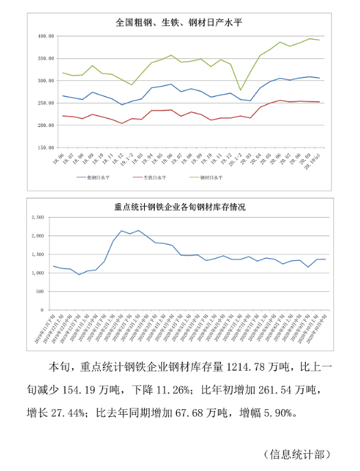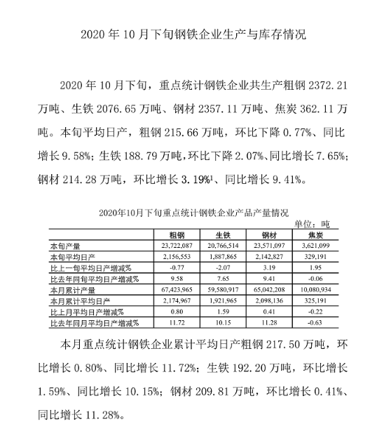 据中钢协数据,2020年10月下旬,重点统计钢铁企业共生产粗钢2372.21万吨,生铁2076.65万吨,钢材2357.11万吨,焦炭362.11万吨。