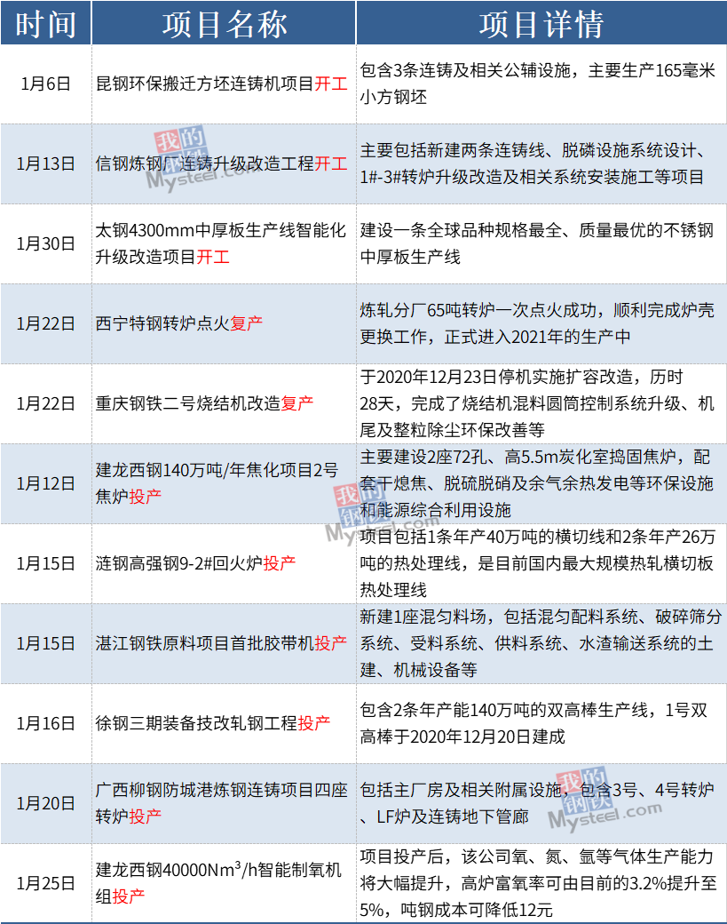 据Mysteel不完全整理,2021年1月有11个钢铁项目开工复产投产。其中,昆钢环保搬迁、信钢炼钢厂和太钢中厚板3家钢企相关项目开工;西宁特钢、和重庆钢铁2个钢铁项目复产;建龙西钢、涟钢、湛江钢铁、徐钢、广西防城港和建龙西钢智能制氧机组等6个钢铁项目投产,具体内容如下: