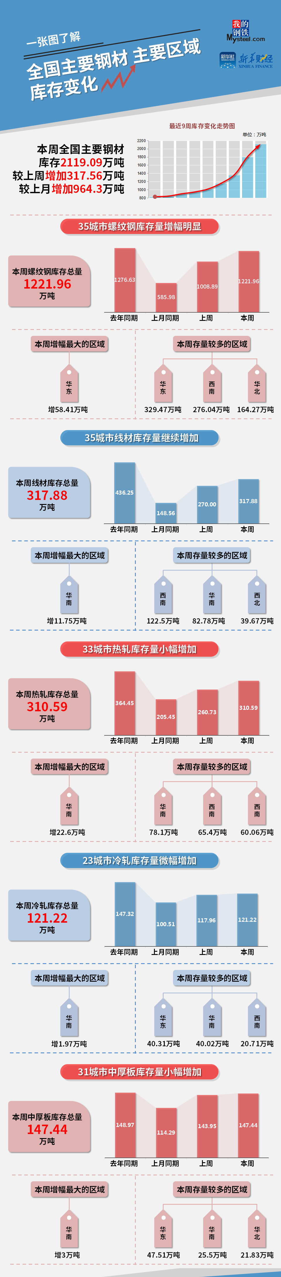 Mysteel和新华财经统计数据显示,本周(2月19日-2月25日),全国主要钢材社会库存2119.09万吨,较上周增加317.56万吨,较上月同期增加964.3万吨;螺纹钢库存1221.96万吨,较上周增加213.07万吨。