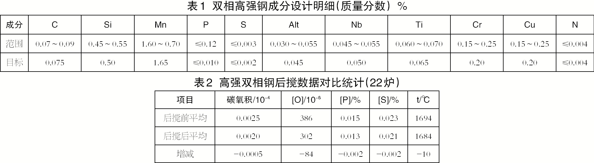 转炉终点采用后搅90s工艺,可降低钢中氧含量,促进碳氧平衡,提高脱氧合金收得率,减少脱氧夹杂。高强双相钢采用后搅工艺后的数据统计分析如表2所示。