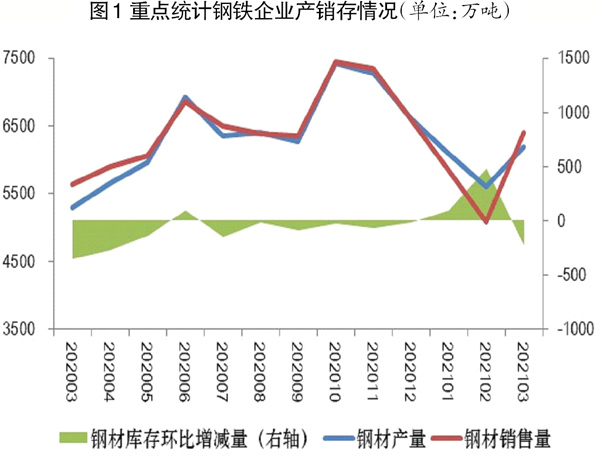据营销月报统计,3月份,重点统计钢铁企业生产钢材6194.25万吨,比去年同期增长17.08%,钢材日产水平为199.81万吨,日产量环比下降0.24%;销售钢材6401.21万吨,比去年同期上升13.46%,钢材日销水平为206.49万吨,日销量环比上升13.63%,其中国内销售钢材6113.41万吨、比去年同期上升13.99%,直接出口钢材287.80万吨、比去年同期上升3.34%;钢材产销率103.34%,环比上升12.51个百分点。上述统计数据表明:重点统计钢铁企业3月份钢材生产、销售同比大幅增长,说明钢材市场明显好于去年疫情期间水平。3月日产量环比下降、日销量环比上升,钢材产销率环比上升,春节假期过后,国内市场需求恢复,重点统计钢铁企业在控制生产的基础上,消耗了一部分库存。重点统计钢铁企业3月份钢材直接出口量同比小幅上升。