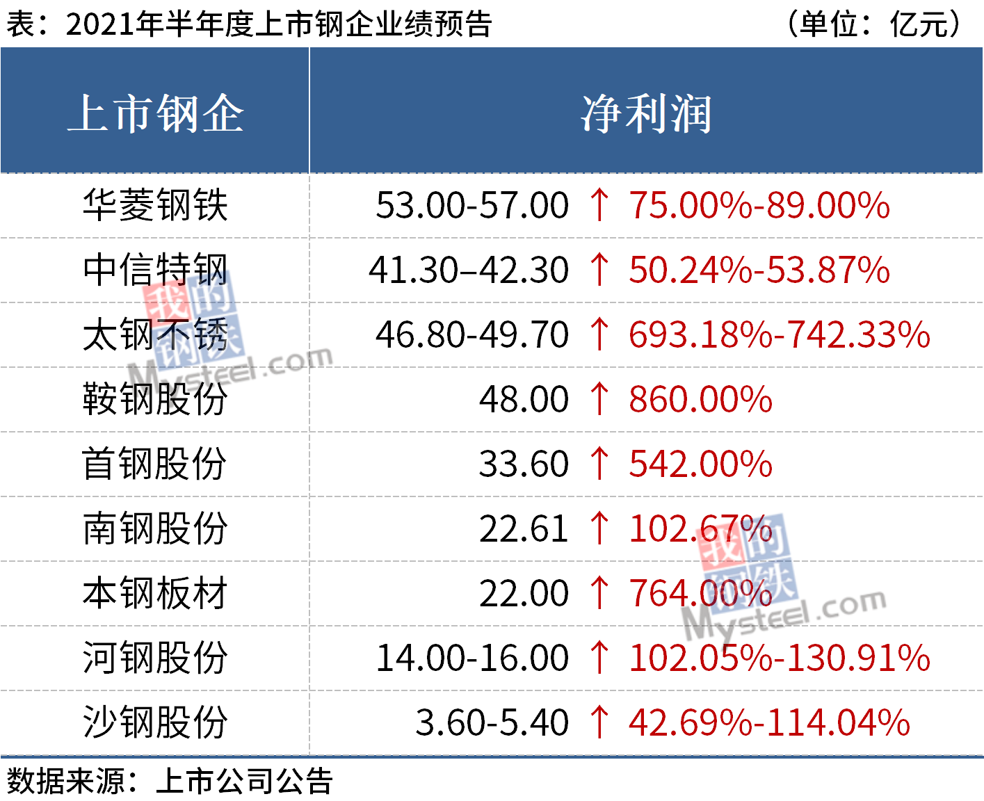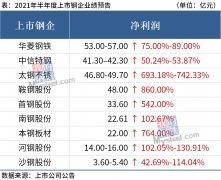 据Mysteel不完全统计,截止6月30日,有9家上市钢企发布2021年上半年业绩预告,且全部预喜。具体如下: