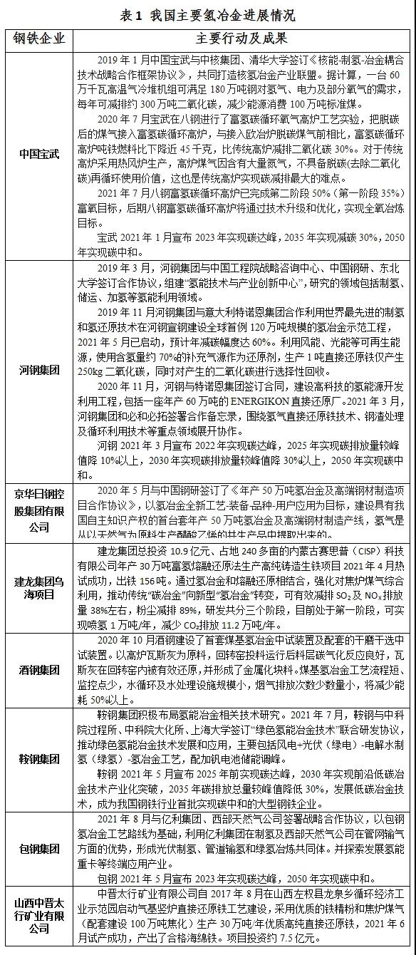 所谓氢冶金就是在还原冶炼过程中主要使用氢气作还原剂,氢冶金目前主要有高炉富氢冶炼和氢直接还原工艺。我国高炉富氢冶炼研究与实践主要是往高炉内喷吹富氢气体,如焦炉煤气、天然气等;氢直接还原工艺主要是利用焦炉煤气发展氢基竖炉直接还原。