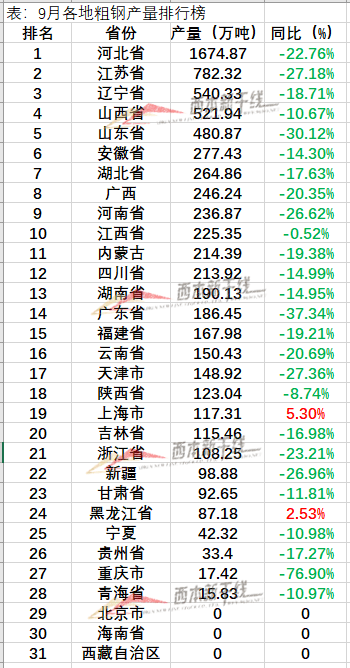 从分省数据来看,11省市9月粗钢产量同比降幅超20%。其中河北降22.76%、江苏降27.18%、山东降30.12%,广西降20.35%、河南降26.62%、广东降37.34%、云南降20.69%、天津降27.36%、浙江降23.21%、新疆降26.96%和重庆降76.90%。