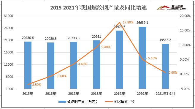 西本讯:国家统计局最新数据显示,2021年9月份,中国钢筋产量为1769.8万吨,同比下降24.7%;1-9月累计产量为19545.2万吨,同比增长0.6%。9月份,中国线材(盘条)产量为1117.1万吨,同比下降27.2%;1-9月累计产量为12056.8吨,同比下降2.3%。