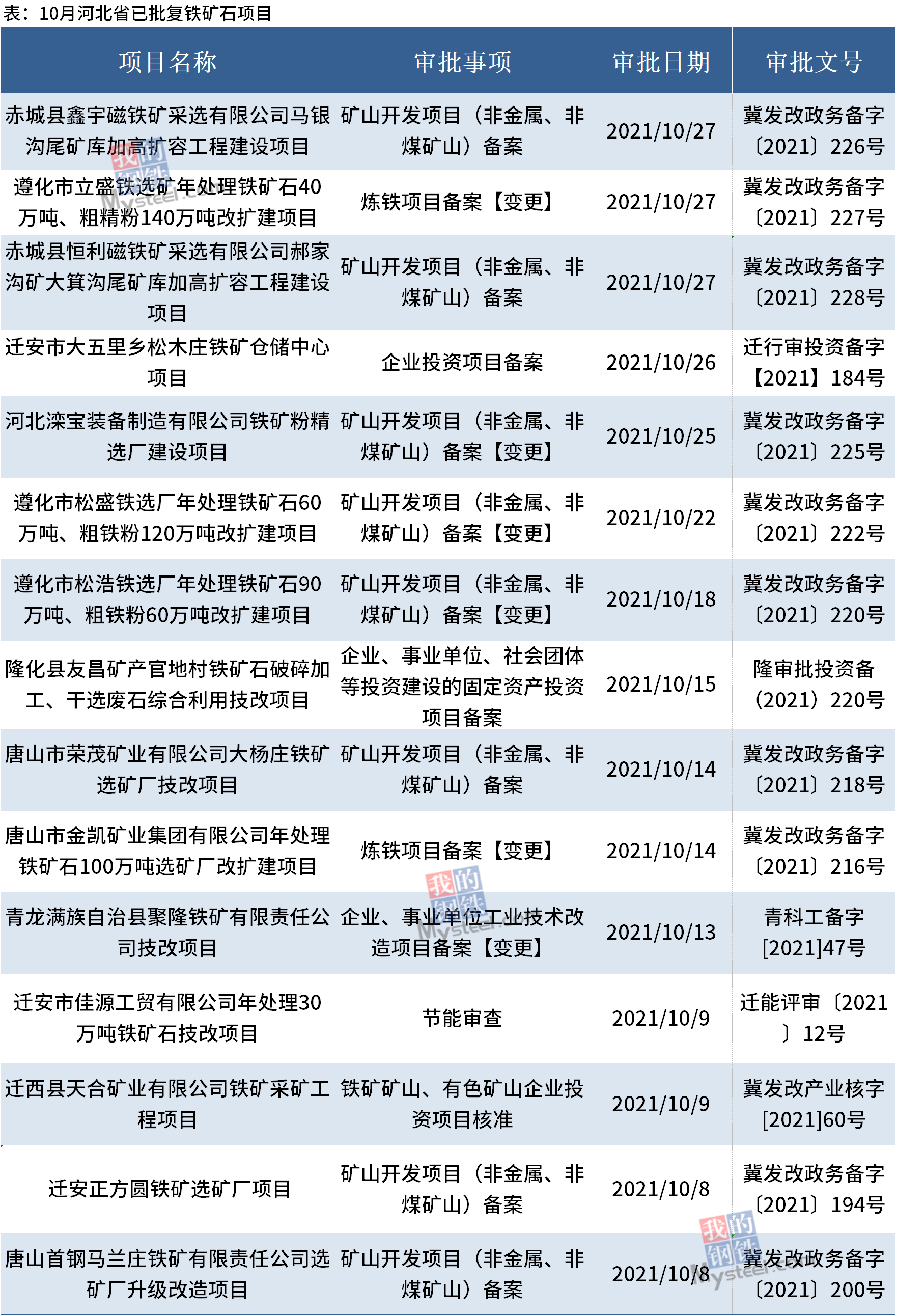 据Mysteel不完全统计,2021年10月河北省共批复铁矿石相关项目15个,其中,有8个矿山开发项目(非金属、非煤矿山)备案(变更),1个企业、事业单位,社会团体等投资建设的固定资产投资项目备案,1个节能审查,1个铁矿矿山、有色矿山企业投资项目核准,1个企业投资项目备案,1个企业、事业单位工业技术改造项目备案(变更)和2个炼铁项目备案(变更),具体情况如下: