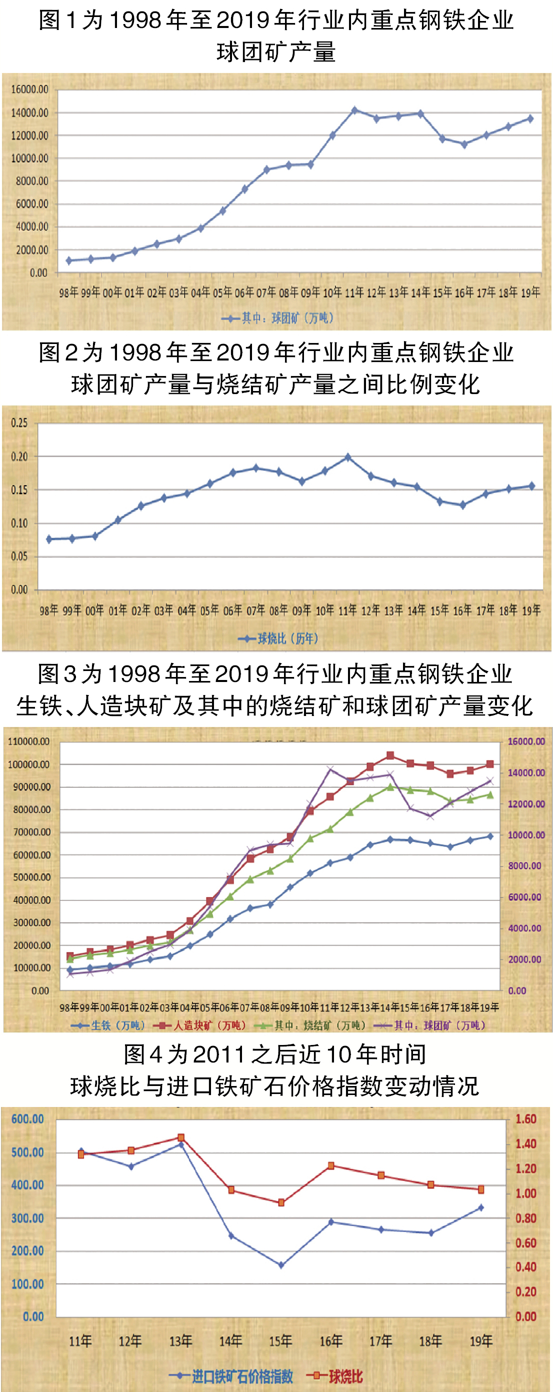笔者分析了20余年行业内重点钢铁企业球团矿产量、球团矿烧结矿产量比例等情况。从图1可以看出,行业重点钢铁企业球团矿产出量从1998年至2011年的12年间一直处于增长阶段,直到2011年达到峰值。之后从2011年到2019年则一直处于波动状态。从图2可以看出,自2011年达到峰值之后,行业重点钢铁企业球团矿与烧结矿产出量之比开始下降。从图3可以看出,自2011年之后,球团矿产量的变化与生铁产量的变化出现明显的不同步现象。