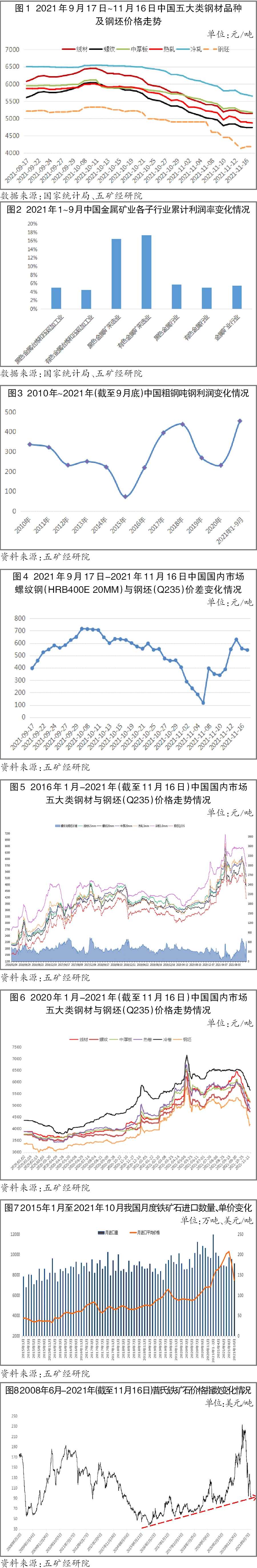 国庆节后,受国家对房地产行业、能源行业宏观调控的影响,以钢材为代表的黑色系商品价格全线下挫。根据中国钢铁工业协会钢材价格指数,10月8日~11月16日,全国五大类钢材品种价格平均下降1106元/吨,其中,线材(直径为6.5毫米)、螺纹钢(HRB400E,直径为20毫米)价格领跌,平均下降1300元/吨以上,而钢坯价格也受迫下降1130元/吨。据不完全调查,由于钢价陡降,目前全国范围内的绝大部分钢材经销商已陷入全面亏损,部分经销商在此轮下行行情中已基本将前期盈利“归零”。