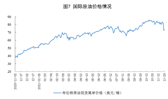 原油进口降幅收窄,国际原油价格下跌。11月份,进口原油4179万吨,同比下降7.9%,降幅比上月收窄3.1个百分点;1—11月份,进口原油46684万吨,同比下降7.3%。11月29日,布伦特原油现货离岸价格为73.3美元/桶,比10月29日下跌11.7%。