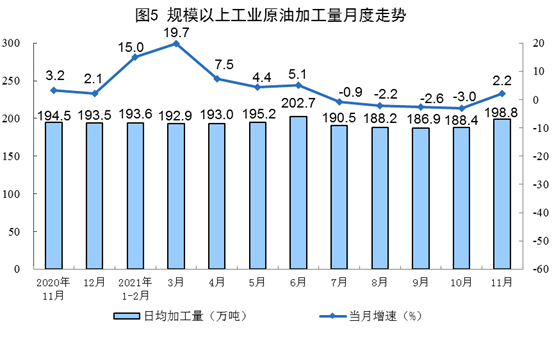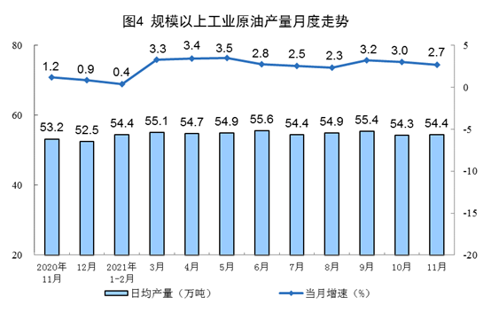 原油生产基本平稳,加工量由降转增。11月份,生产原油1631万吨,同比增长2.7%,增速比上月放缓0.3个百分点,比2019年同期增长3.9%,两年平均增长1.9%,日均产量54.4万吨;加工原油5964万吨,同比增长2.2%,增速由负转正,上月为下降3.0%,比2019年同期增长5.5%,两年平均增长2.7%,日均加工198.8万吨。