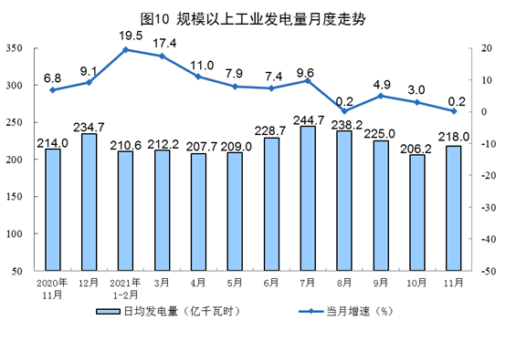 电力生产增速继续回落。11月份,发电6540亿千瓦时,同比增长0.2%,增速比上月回落2.8个百分点,比2019年同期增长7.0%,两年平均增长3.5%,日均发电218亿千瓦时。1—11月份,发电73827亿千瓦时,同比增长9.2%,比2019年同期增长11.3%,两年平均增长5.5%。