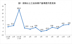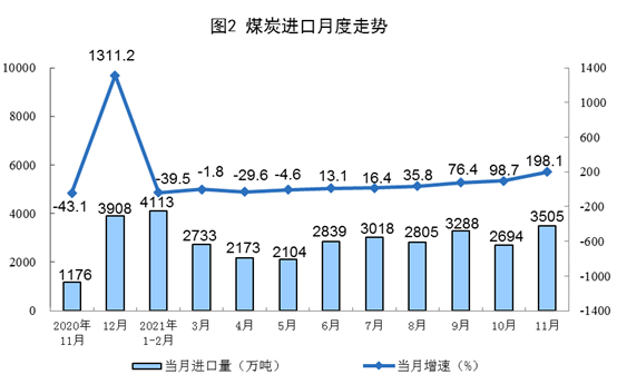 原煤生产有所加快。随着增产保供政策持续推进,11月份,生产原煤3.7亿吨,同比增长4.6%,增速比上月加快0.6个百分点,比2019年同期增长6.1%,两年平均增长3.0%,日均产量1236万吨。进口煤炭3505万吨,同比增长198.1%。
