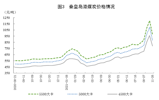 11月26日,秦皇岛港5500大卡、5000大卡和4500大卡动力煤综合交易价格分别为每吨986元、891元和792元,比10月29日分别回落216元、205元和169元。