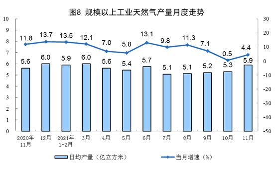 天然气生产加快。11月份,生产天然气177亿立方米,同比增长4.4%,增速比上月加快3.9个百分点,比2019年同期增长16.7%,两年平均增长8.0%,日均产量5.9亿立方米。