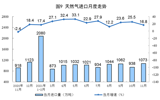 天然气进口有所放缓。11月份,进口天然气1073万吨,同比增长16.8%,增速比上月放缓8.7个百分点。1—11月份,进口天然气10976万吨,同比增长21.8%。