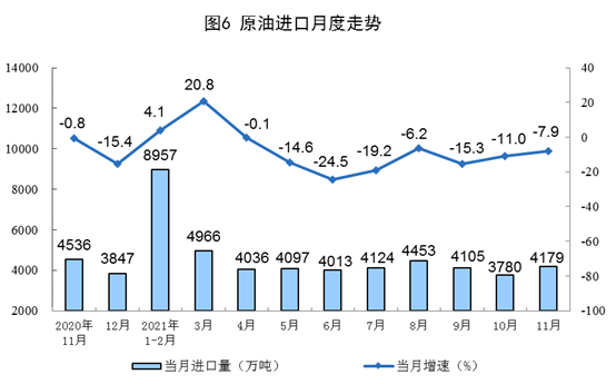 1—11月份,生产原油18248万吨,同比增长2.5%,比2019年同期增长4.2%,两年平均增长2.1%;加工原油64479万吨,同比增长4.9%,比2019年同期增长8.2%,两年平均增长4.0%。