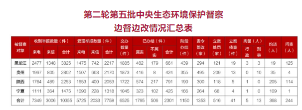截至12月28日晚20:00,各督察组共收到群众来电、来信举报10355件,受理有效举报7758件,经梳理合并重复举报,累计向相关省(区)转办6525件。相关省(区)已办结或阶段办结3451件。其中,立案处罚516家,立案侦查41件,拘留18人;约谈党政领导干部368人,问责党政领导干部244人。