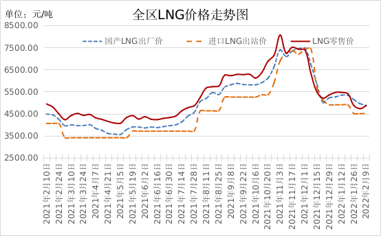 节后复工,下游补货,天然气零售价格小幅上涨。2月9日,全区国产LNG平均出厂价格为4872.20元/吨,环比下降1.62%,同比上涨8.81%;进口LNG平均出站价格为4500.00元/吨,环比持平,同比上涨11.11%。LNG平均零售价格为4858.25元/吨,环比上涨2.86%,同比下降1.62%;CNG平均零售价格为3.82元/立方米,环比持平,同比上涨6.64%。