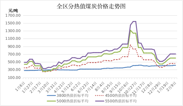 本周,春节后动力煤产量快速回升,价格稳定。2月9日,全区动力煤平均坑口价格为420.29元/吨,与2月第一周相比(下称环比)价格持平,与2021年2月第二周(下称同比)上涨41.64%。其中,东部地区褐煤平均坑口价格为361.71元/吨,环比持平,同比上涨39.72%;鄂尔多斯地区动力煤平均坑口价格596.25元/吨,环比价格持平,同比上涨50.47%。分热值来看,3800、4500、5000、5500热值动力煤坑口平均折标价格分别为每吨410.89元、460.33元、600.00元、705.00元,环比,3800热值动力煤坑口折标价格因热值变动略降0.51%,4500、5000、5500热值动力煤价格均持平,同比,3800、4500、5000、5500热值动力煤价格分别上涨41.10%、35.26%、50.00%、53.26%。
