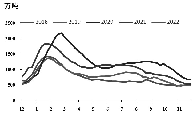 图为螺纹钢总库存走势(单位:万吨)