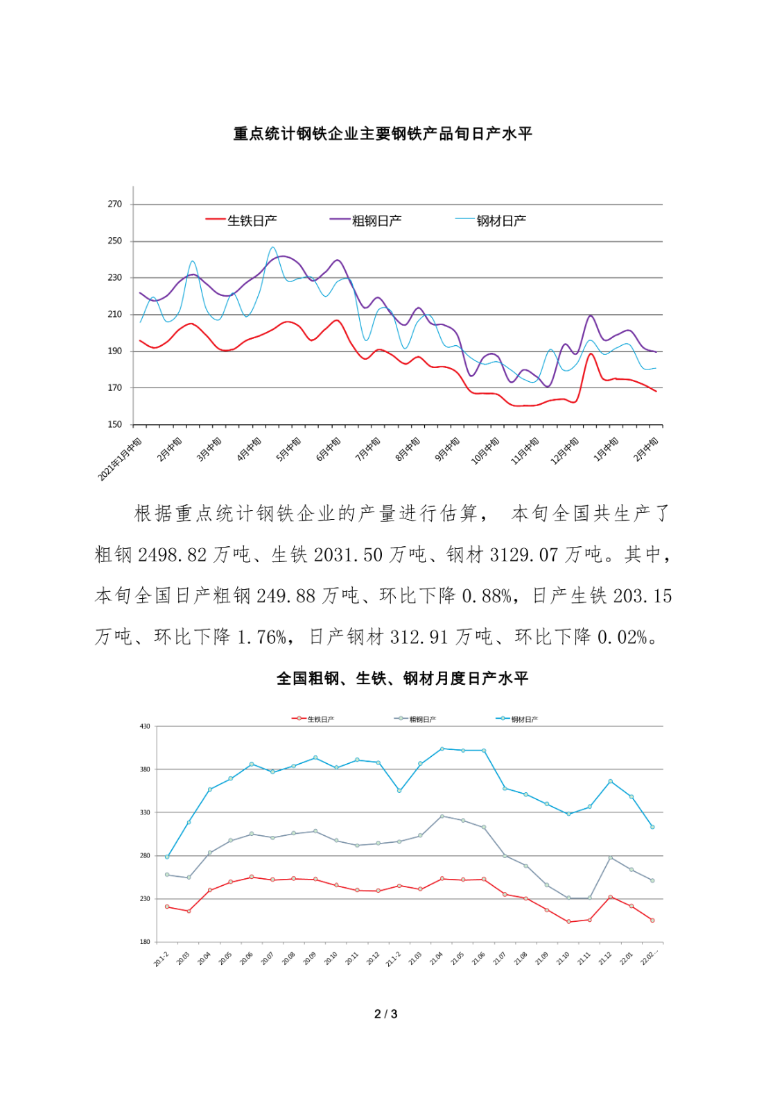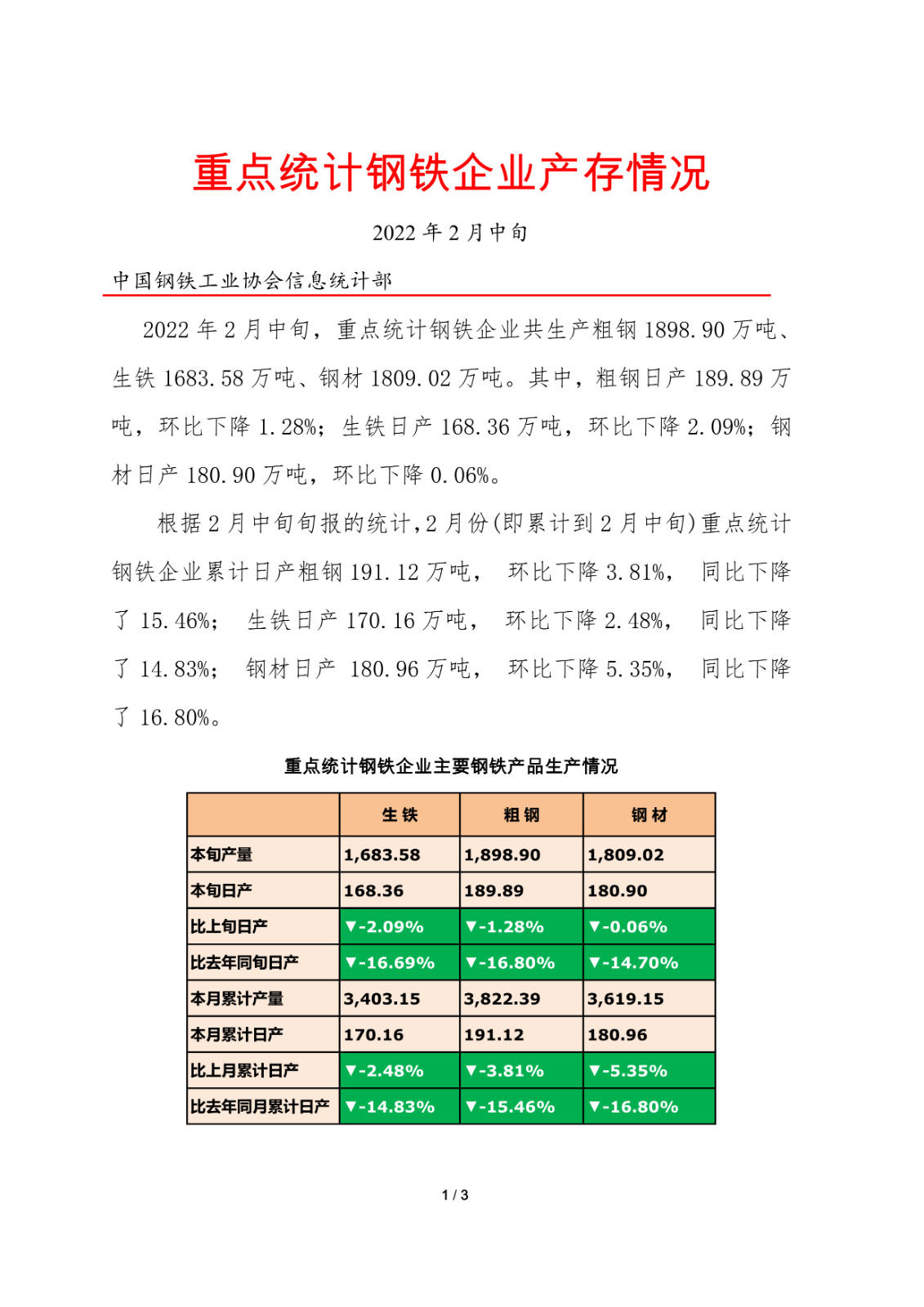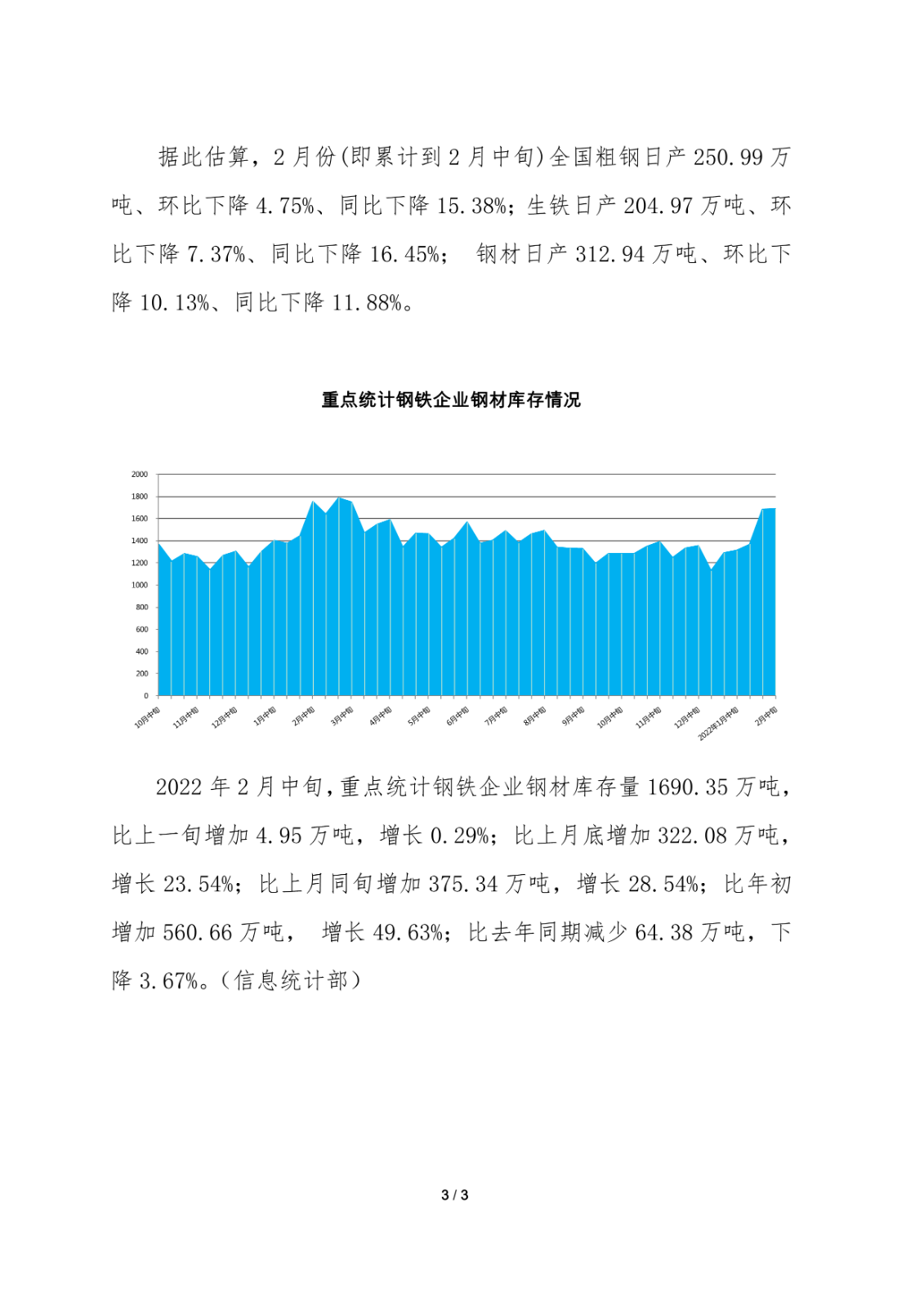 据中钢协最新数据,2022年2月中旬,重点钢企粗钢日均产量189.89万吨,环比下降1.28%;钢材库存量1690.35万吨,比上一旬增加4.95万吨,增长0.29%。