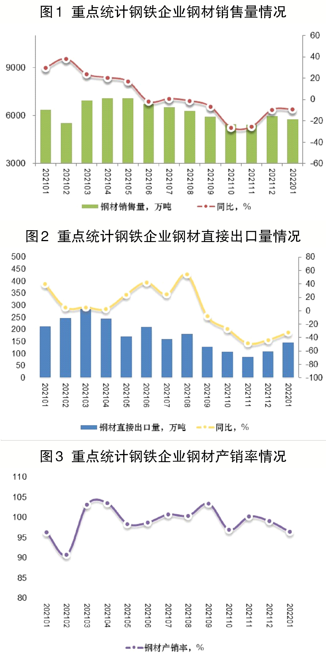 上述统计数据表明,在振作工业经济运行政策措施的引领下,钢铁行业需求逐步企稳回升,但受季节性、春节假期等影响,钢材国内市场需求减少,日销环比下降。钢材直接出口量呈增长态势,连续2个月同比降幅收窄、环比上升,1月份环比上升32.44%。钢材产销率连续2个月小幅下降,鉴于季节性、环境性等多重因素对需求端的影响,钢铁供需变化仍需密切跟踪和关注,以实现供需动态平衡。