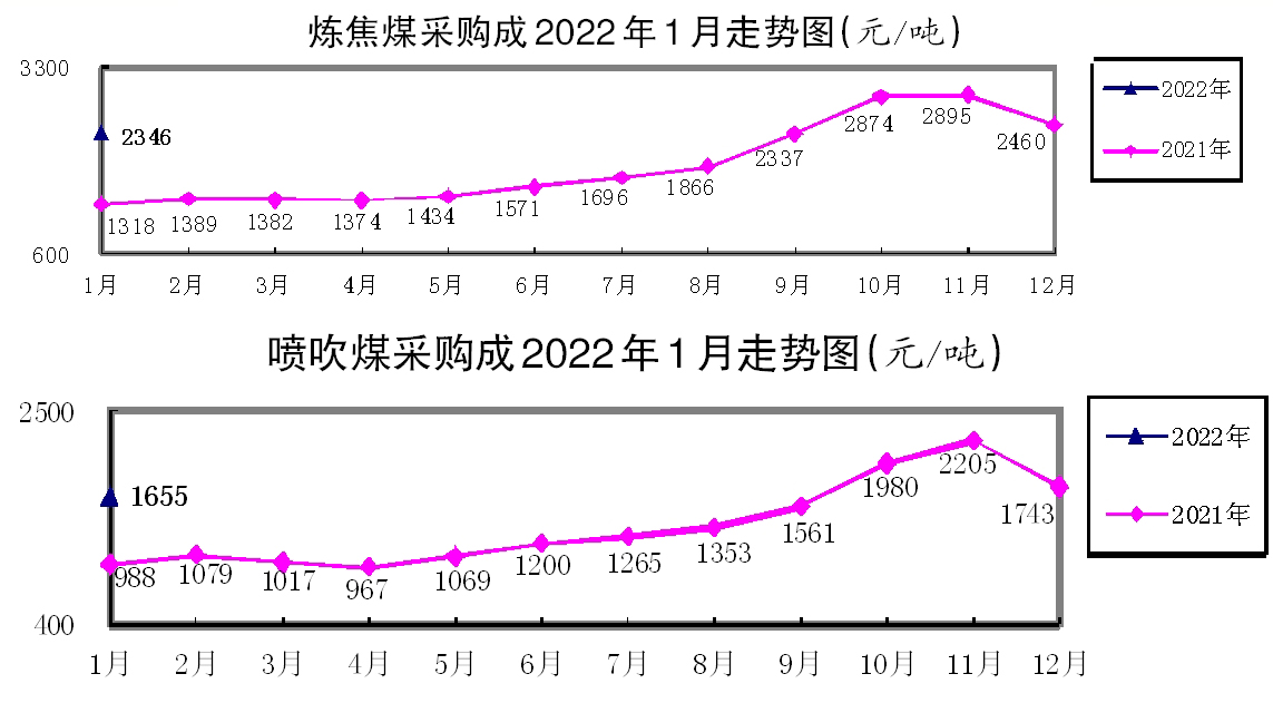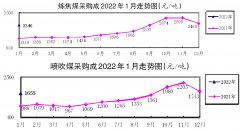 1月份,对标企业炼焦煤加权平均折算成干基的采购成本为2346.38元/吨,环比下降114.05元/吨,降幅为4.64%;同比升高1028.05元/吨,升幅为77.98%。