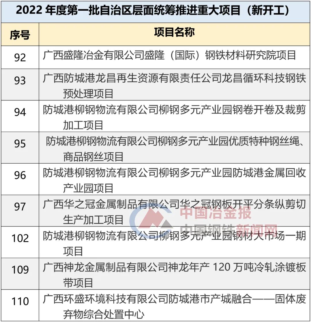 在新开工的190个重大项目中,涉及防城港市9个钢铁项目,具体名单整理如下——