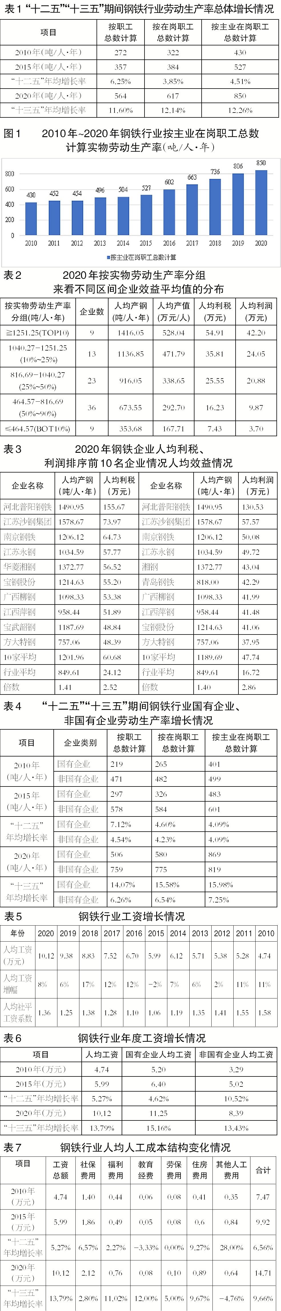 表9及上述分析告诉我们,“十三五”钢铁行业劳动生产率持续大幅提高,行业效益回升,人均工资、人工成本增幅明显大于“十二五”,且在大于社会职工平均工资增幅的情况下,通过大力提高劳动生产率,使吨钢人工成本有所下降,劳动分配率、人事费用率明显下降,人工成本投入产出明显上升。