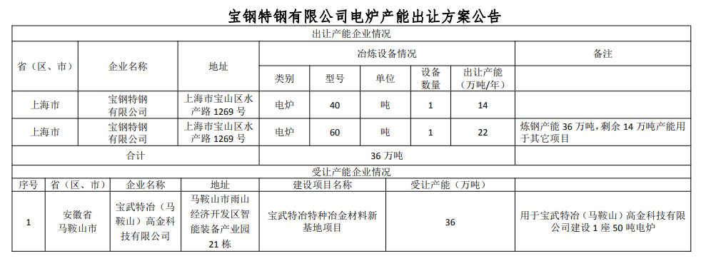 按照《国务院关于化解产能严重过剩矛盾的指导意见》、《国务院关于钢铁行业化解过剩产能实现脱困发展的意见》和《钢铁行业产能置换实施办法》要求,经国务院国资委(国资厅改革〔2021〕273号)复函同意,拟将宝钢特钢有限公司电炉产能出让。现将宝钢特钢有限公司1座40吨电炉和1座60吨电炉对应36万吨炼钢产能出让方案予以公告,欢迎社会公众进行监督。