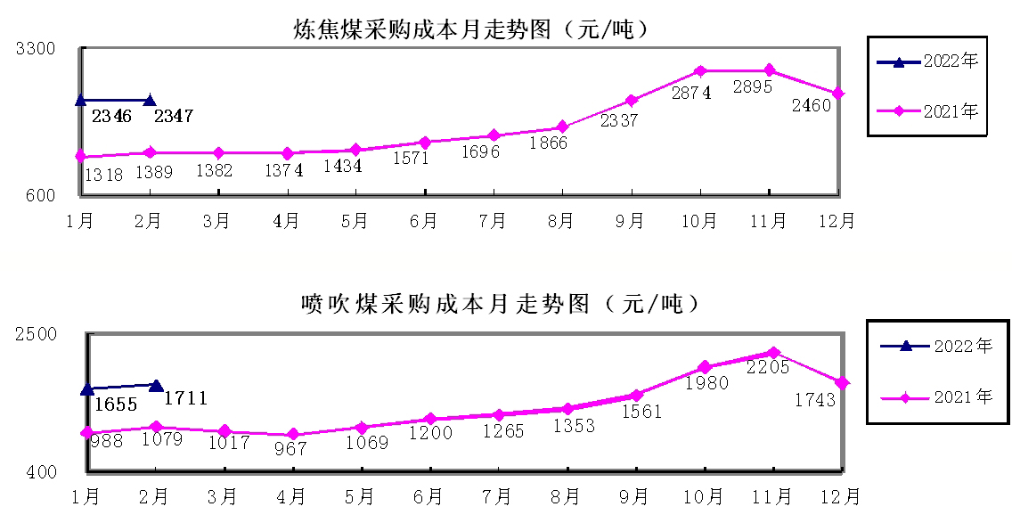 2月份,对标企业喷吹煤加权平均折算成干基的采购成本为1710.63元/吨,环比升高55.67元/吨,升幅为3.36%。1月~2月份,累计平均折算成干基的采购成本为1679.18元/吨,同比升高645.68元/吨,升幅为62.47%。