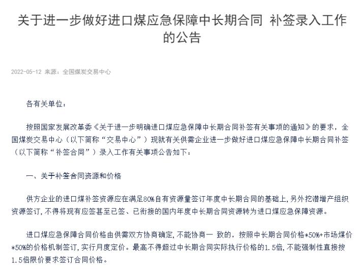 中新财经5月12日电 5月12日,全国煤炭交易中心发布《关于进一步做好进口煤应急保障中长期合同 补签录入工作的公告》(以下简称《公告》)。