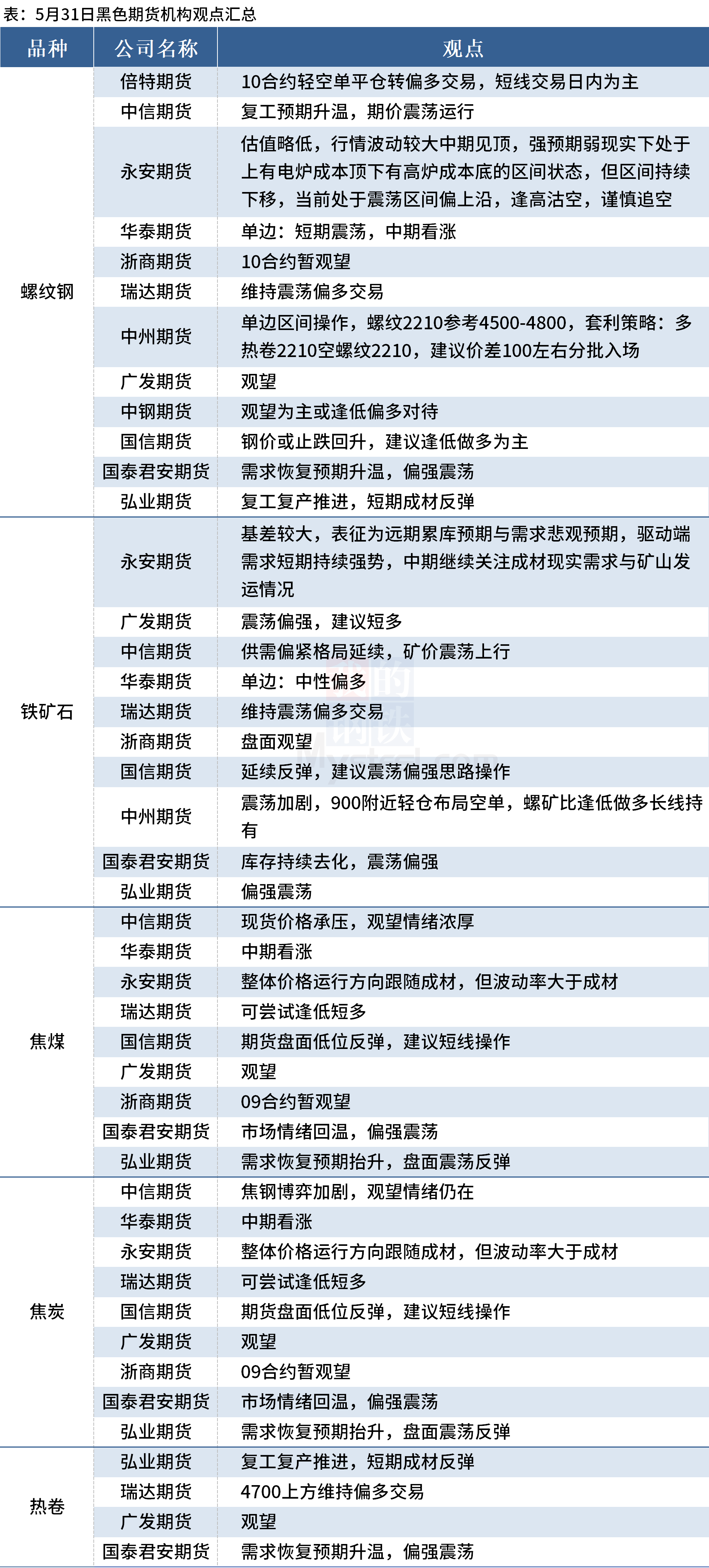 据Mysteel统计5月31日11家期货机构操作策略,其中多数机构预计螺纹钢维持震荡,铁矿石盘面偏强震荡,焦煤、焦炭震荡反弹。具体汇总内容如下: