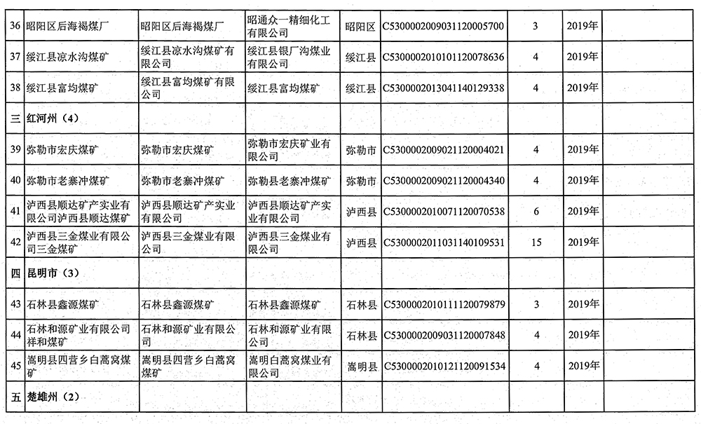 按照《国务院关于煤炭行业化解过剩产能实现脱困发展的意见》(国发〔2016〕7号)、《国家发展和改革委员会关于做好2019年钢铁煤炭行业化解过剩产能验收工作的通知》(发改电〔2019〕538号)、《国家部际联席会议办公室关于做好钢铁煤炭去产能公示公告工作的通知》和《云南省人民政府办公厅关于印发〈 云南省煤炭产业高质量发展三年行动计划(2019—2021年))〉 的通知》(云政办发〔2019〕61号)等文件要求,结合我省现场验收情况及州(市)公告情况,现按程序对《云南省2019年煤炭行业淘汰落后和化解过剩产能退出煤矿名单》予以公告。