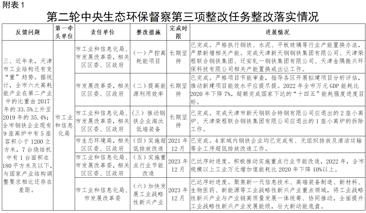 反馈问题:近年来,天津市工业结构还有变“重”趋势。据统计,全市六大高耗能产业在第二产业中的比重由2017年的33.5%上升至2019年的35.4%;全市钢铁企业现有9座高炉中有5座容积小于1200立方米,7台烧结机中有1台面积在180平方米及以下,与国家产业结构调整要求相比还存在差距。